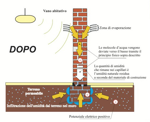 Laddove l’acqua contenuta nel terreno bagna un muro alla sua base, si crea una differenza di potenziale con valore elettrico misurabile di circa 200/330 mV. Le molecole d’acqua, a causa di questo impulso elettrico, si spostano sempre dal polo positivo (+), verso il polo negativo (-): Vedi Figura (A). Questo forza spinge l’acqua verso la parte alta del muro fino al livello in cui la forza di gravità diventa tale da contrastare la spinta elettrica verso l’alto. Immediatamente sotto a questo livello neutro, le molecole d’acqua continuano comunque a spingere verso l’alto creando così un movimento d’acqua verso i lati del muro. Non potendo più risalire, l’acqua fuoriesce dal muro sotto forma di vapore. Abbiamo così un flusso continuo di molecole d’acqua che evapora in continuazione (aumento dell’ umidità negli ambienti) trasportando con se e concentrando cristalli di sale provenienti dal terreno e dai materiali che compongono il muro.